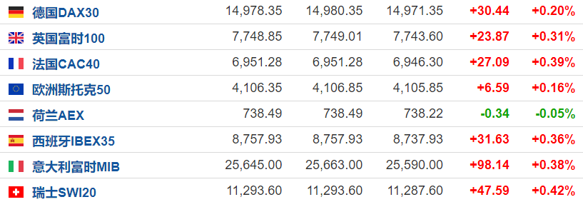 欧洲主要指数多数上涨,德国DAX30涨0.53%,$英国富时100(VUKE.UK)$涨0.34%,法国CAC40涨0.63%。