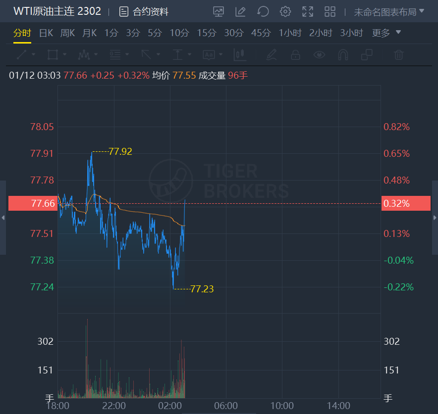 原油期货震荡走高,WTI原油报77.66美元/桶,涨0.32%;布油现报82.95美元/桶,涨0.34%。