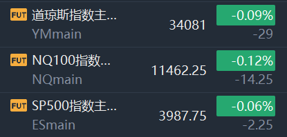 美股三大股指期货微幅走低,截至发稿,道指期货跌0.09%,纳斯达克100指数期货跌0.12%,标普500指数期货跌0.06%。