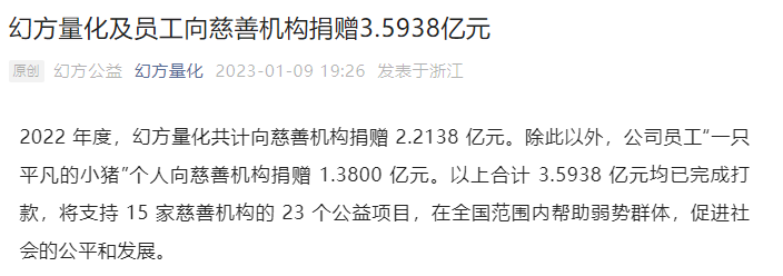 根据公告,2022年度,幻方量化共计向慈善机构捐赠 2.2138 亿元。除此以外,公司员工“一只平凡的小猪”个人向慈善机构捐赠 1.38 亿元。以上合计 3.5938 亿元均已完成打款,将支持15家慈善机构的23个公益项目。