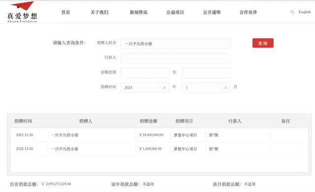 1月10日,此事被曝光后,网友纷纷猜测“一只平凡的小猪”身份。南都·湾财社记者在上海真爱梦想公益基金会官网搜索发现,2022年12月20日,捐赠人“一只平凡的小猪”分两笔向梦想中心项目合计捐赠2000万元,与幻方量化披露捐助项目与捐赠金额一致。