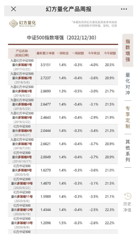 私募排排网数据显示,幻方量化旗下共有502只基金,截至2023年1月10日,幻方量化累计投资收益170.57%,近一年收益12.26%。1月9日私募排排网发布的私募业绩榜单显示,幻方量化2022年收益为0.38%,成为25家2021年、2022年均收益百亿私募之一。