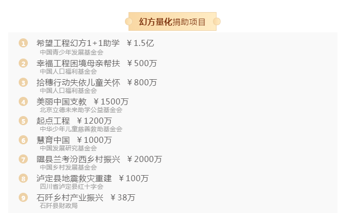 据了解,幻方量化此次捐助项目涉及希望工程、幸福工程困境母亲帮扶、美丽中国支教、起点工程等9个项目。“一只平凡的小猪”捐助项目涉及白血病求助小天使基金、乡村工匠、新长城高中生助学等14个项目。