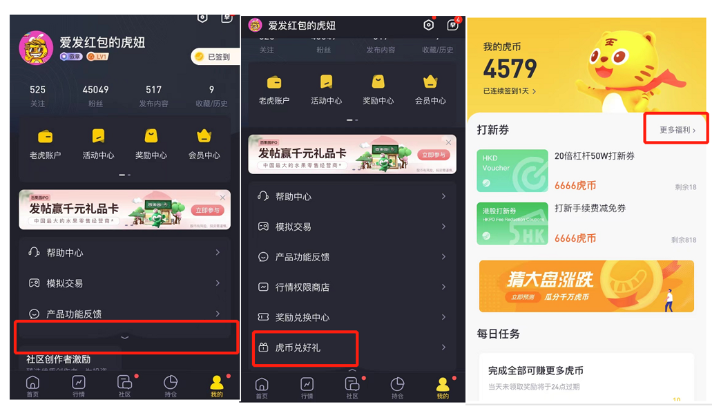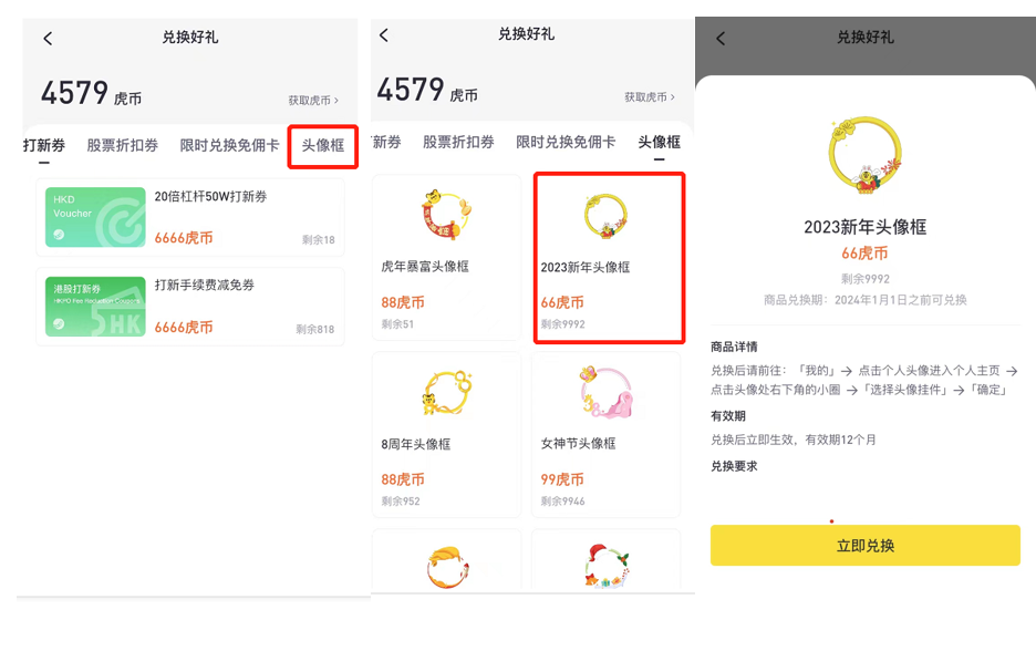 进入APP“我的”页面,点击这个小三角展开,点击“虎币兑好礼”,点击“更多福利”,点击“头像框”,选择“2023新年头像框”,立即兑换!兑换之后,要选择佩戴,就能在个人主页看得到啦~