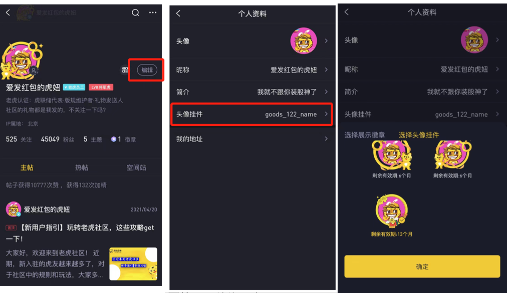 点击头像,进入“个人主页”页面,点击“编辑”,点击“头像挂件”,选择佩戴即可。
