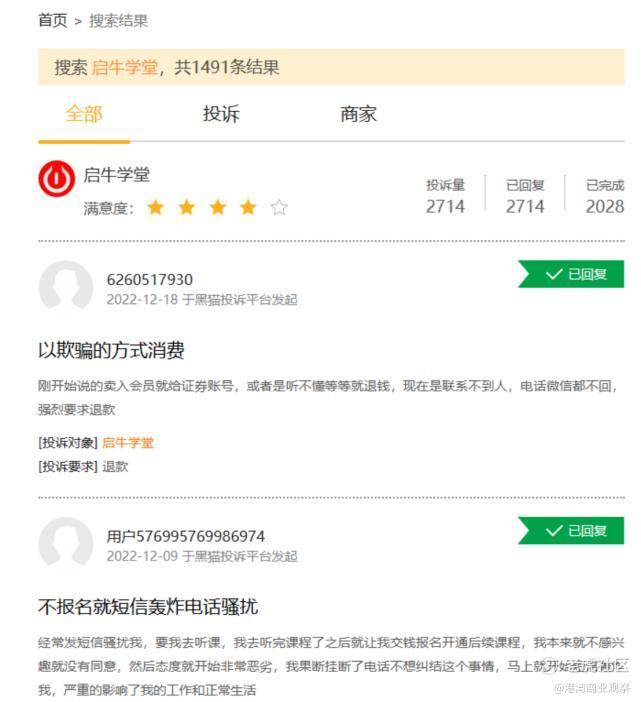 除媒体报道外,在黑猫投诉平台搜索关键词启牛学堂,截至1月4日,共计有投诉量2714条,已完成2028条,其中近30天投诉量37条。消费者投诉问题主要集中在诱导消费者、欺骗消费者、虚假宣传、违规收费、电话骚扰等。