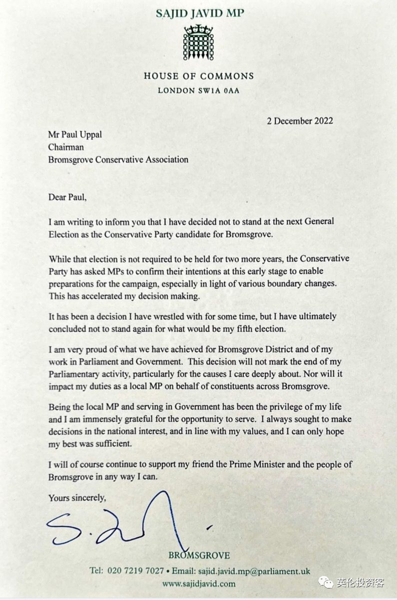 贾维德在推特上发布了一封致保守党主席的信。他在信中表示,这是他“纠结了一段时间后的决定”,保证这一决定不会影响他在剩余任期内作为Bromsgrove议员的工作。