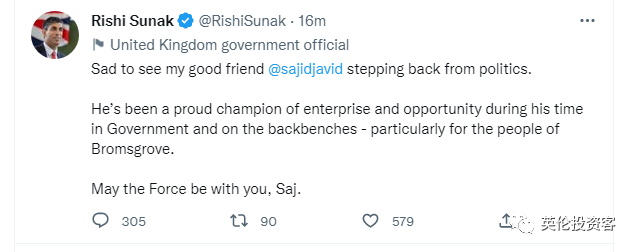 英国首相苏纳克表示,对好朋友的这一决定感到难过,并引用了《星球大战》中的一句话祝福贾维德:“萨吉,愿原力与你同在(May the Force be with you, Saj.)。”