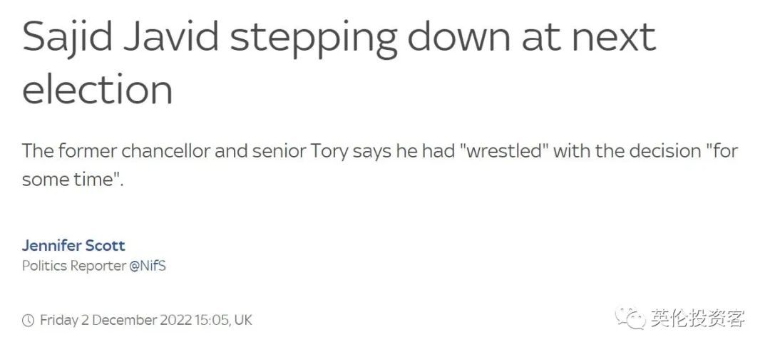 英国前财政大臣贾维德退出下一届大选