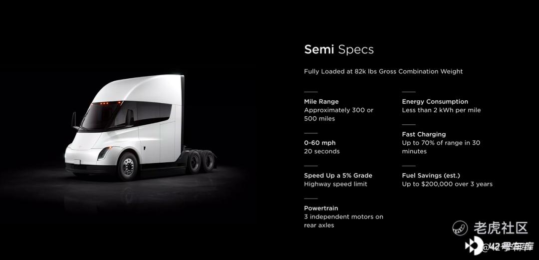 12 月 1 日,Semi 的交付正式启动,预计会提供满载续航 300 英里(483 千米)、500 英里(805 千米)两个版本的车型,能够实现 30 min 内电量 0—70%。