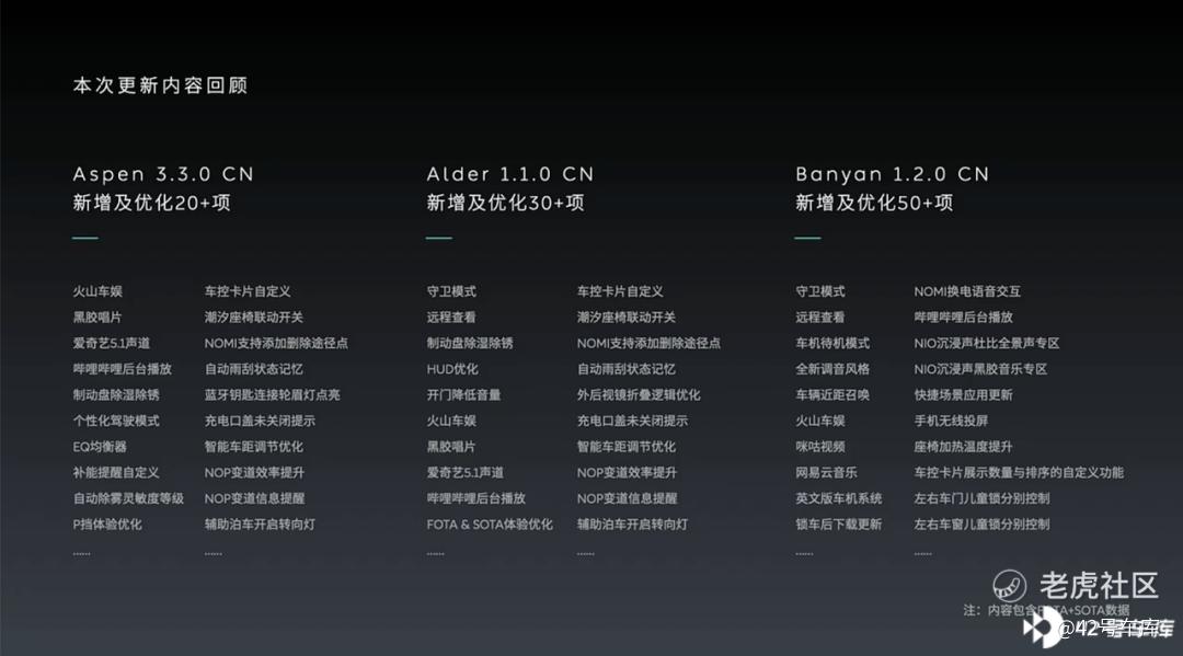 Alder· 赤杨固件升级至 1.1.0 版本,新增守卫模式、远程查看车外实况、火山车娱、黑胶专区、HUD 三种导航模式等功能;Aspen· 白杨固件升级至 3.3.0 版本,新增火山车娱、黑胶专区、EQ 均衡器等功能,并对 NIO Pilot 进行多项体验优化。