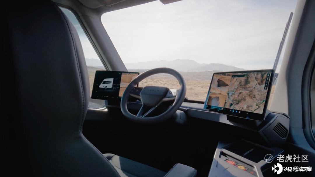 两块大屏很可能是 Model 3 的同款,而 Semi 的方向盘类似 Model 3 和新款 Model S 的结合体,保留了左右拨杆的同时加入了触摸按键。