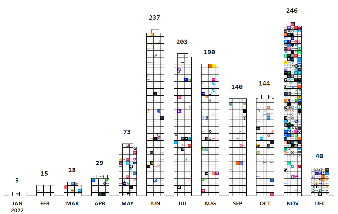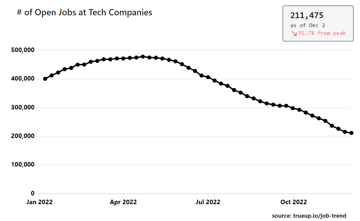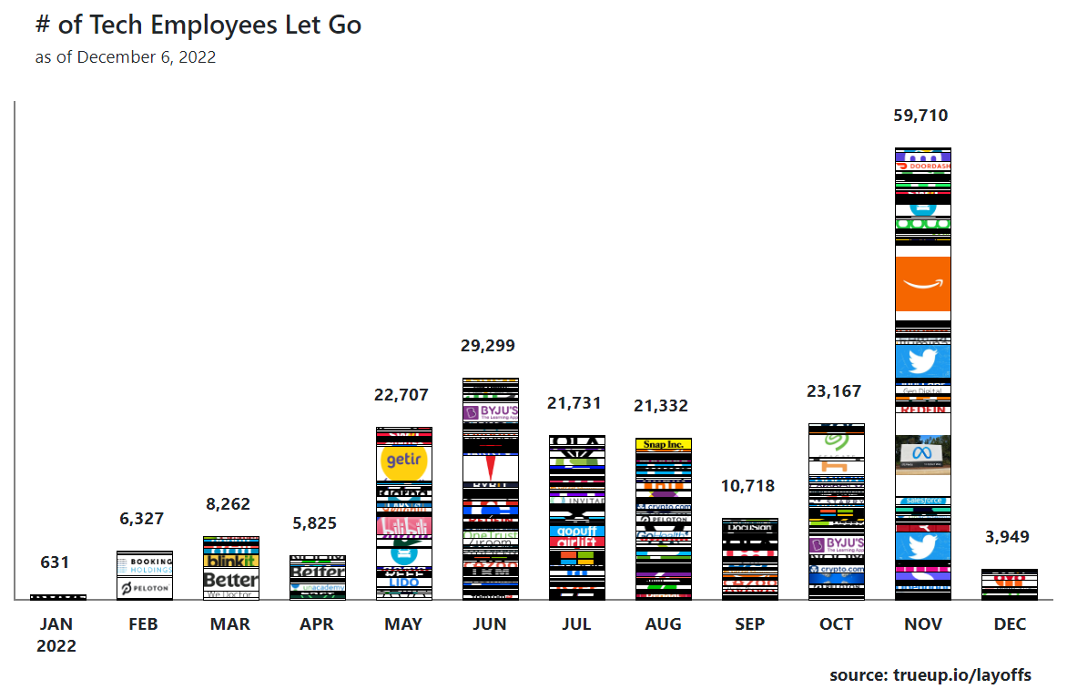 根据三方数据机构Trueup的统计,2022年至今(截至12月5日),共有1338家裁员的科技公司(主要为美股上市公司),213648人受到了裁员影响,其中6月和11月为裁员高峰。