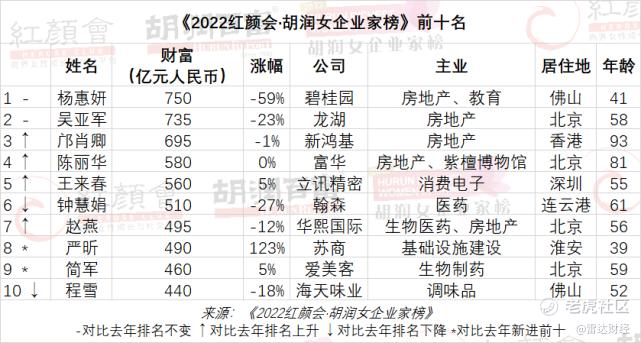 12月12日,胡润研究院携手红颜会联合发布《2022红颜会·胡润女企业家榜》(Herose Club · Hurun Richest Women in China 2022),列出了今年胡润百富榜上前50名女企业家。与胡润百富榜总榜不同,女企业家榜单独计算那些能够从家族财富中剥离出的女企业家的个人财富。财富计算的截止日期为2022年9月15日。这是胡润研究院连续第十七次发布此榜单。