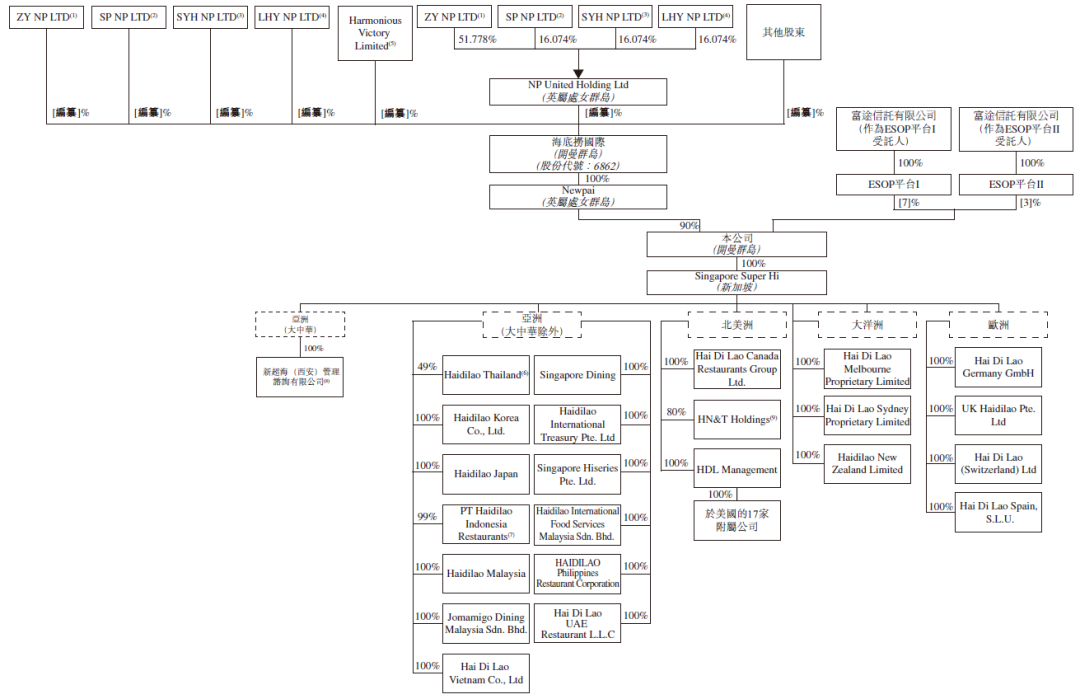 截至2022年12月2日,张勇先生、舒萍女士夫妇, 分别通过ZY NP LTD、SP NPLTD,以及共同通过NP United Holding Ltd合共持有海底捞60.35%的股份。