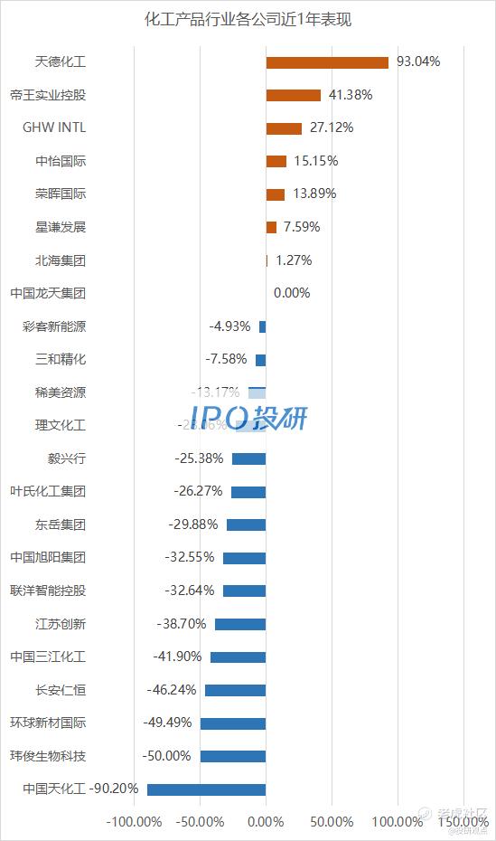 近1年涨幅最大的是天德化工(00609.HK),涨幅为93.04%;跌幅最大的是中国天化工(00362.HK),跌幅为-90.20%。