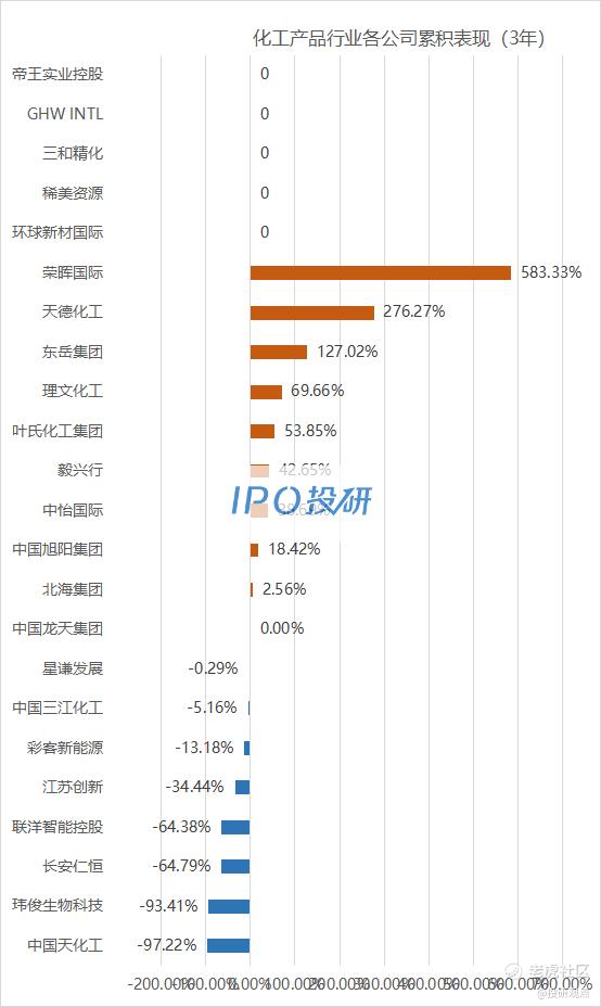 累计表现涨幅最大的是荣晖国际(00990.HK),涨幅为583.33%;跌幅最大的是中国天化工(00362.HK),跌幅为-97.22%。