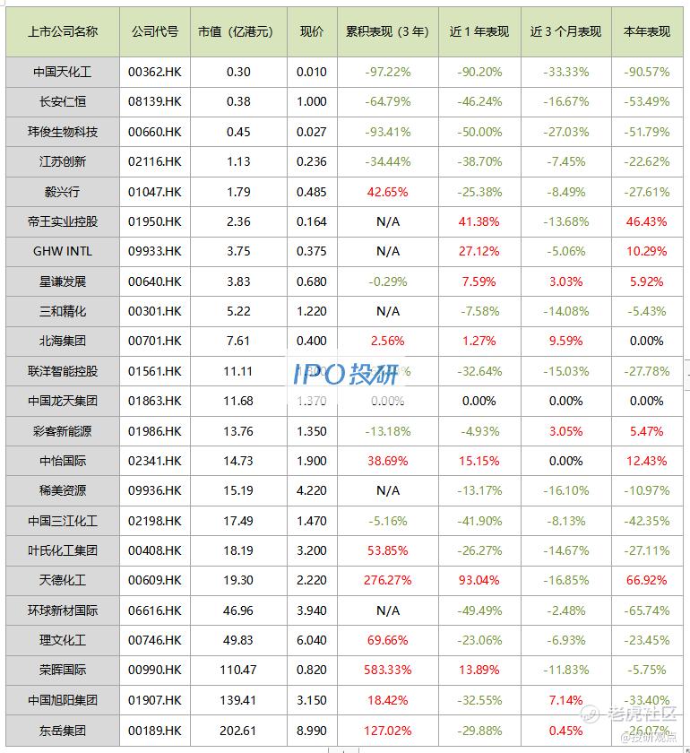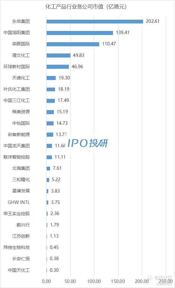 3、市值最高的是东岳集团(00189.HK),市值为202.61亿元;市值最低的是中国天化工(00362.HK),市值为0.30亿元。