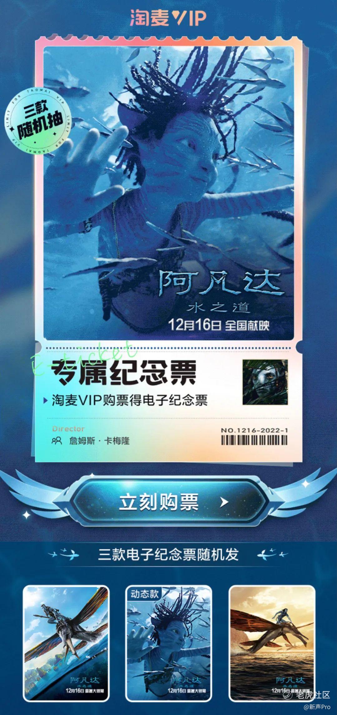 淘麦VIP会员购买《阿凡达:水之道》电影票即可获得电子纪念票1张