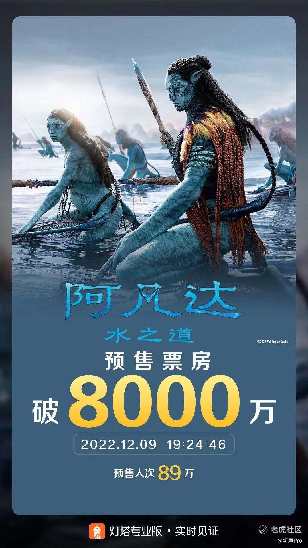 对于众多影迷来说,近期最令人兴奋的消息便是迎来了《阿凡达:水之道》(以下简称「《阿凡达2》」)的内地定档。12月7日,影片正式开启预售,据灯塔专业版数据,截至12月9日19:24,其预售总票房已突破8000万。