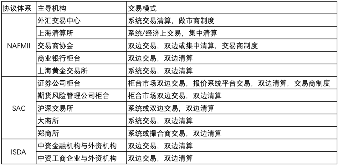 中国场外衍生品市场的发展由监管机构自上而下进行主导。不同监管体系下的子市场采用不同的主协议体系相互独立发展,包括NAFMII体系下的银行间场外衍生品市场、SAC体系下的证券期货场外衍生品市场以及ISDA体系下的外资机构柜台市场。