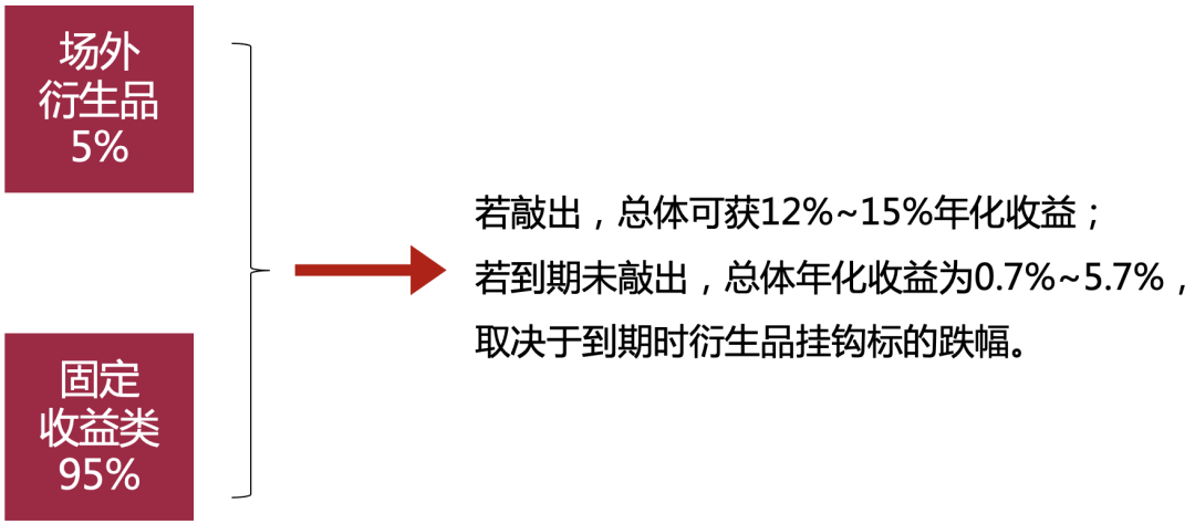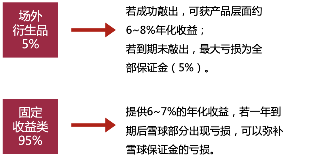 即使一年到期后未敲出,固定收益类资产提供的收益可以弥补雪球部分保证金的亏损,锁定了产品层面的净值下行风险。