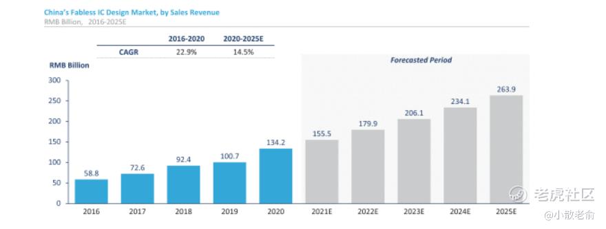 在无晶圆厂模式全球流行的影响下,中国大陆无晶圆厂IC设计的市场规模以销售收入计算也快速增长。根据弗若斯特沙利文的资料,市场规模由 2016 年的人民币 588 亿元增至 2020 年的人民币 1,342 亿元,复合年增长率为 22.9%。预计2025年无晶圆厂IC设计的销售收入将达到人民币2639亿元,2020年至2025年的复合年增长率为14.5%。