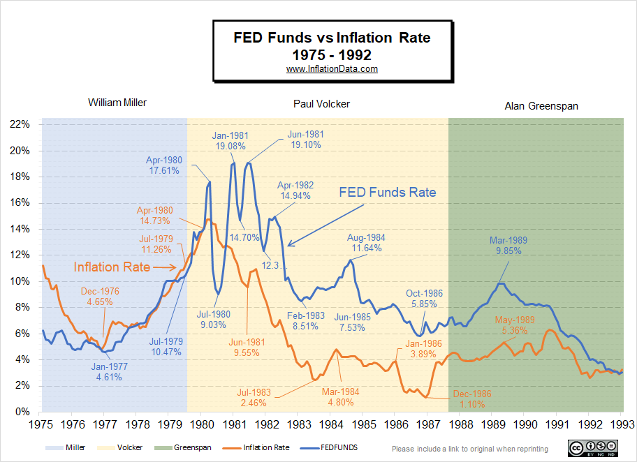 现在的美联储主席和当时坚决的保罗沃克尔做个比较,都可以发现巨大差异。保罗沃克尔为了压住通胀,非常果断地将基准利率抬升到近20%的水平。