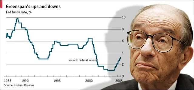 2000年开始美联储利率就开始不断调低,并且刺激了他口中所谓的非理性繁荣,他所犯的最大错误在于,他寄望于有后路的升息,或是寄望于折衷的办法,来让经济避免过热。结果最终经济泡沫迅速扩大,最终危机爆发。