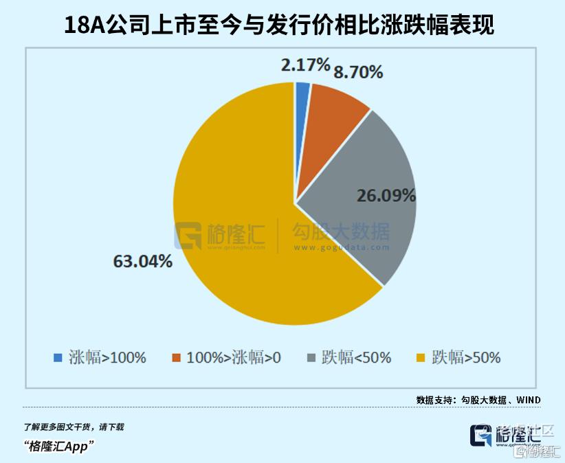 根据WIND数据显示,港交所上市的18A企业中,上市至今没有破发的不到十家,上市后腰斩的公司不在少数,63.04%的18A上市企业已经跌幅超过50%。