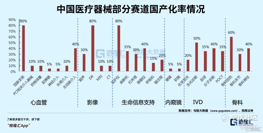 根据西南证券统计,目前我国医疗器械除了部分领域(如冠脉支架、监护仪、生化诊断、DR、骨科创伤类等)国产化率超过50%,其他产品的国产化率不高,部分龙头市场份额仅为个位,其中包括以药物球囊、起搏器、神经介入、外周介入等为代表的血管介入领域等。