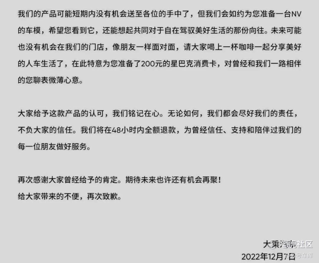 本来在 12 月要交付的产品,现在变成了一个小小的车模。对消费者来说,48 小时押金全退情理之中法理之下。一个车模的赠予,算是对期待的补偿。更何况自游家还准备了一张 200 元的星巴克消费卡,可以让你和朋友们优雅地聊着这家有点有趣,但将要离去的公司。