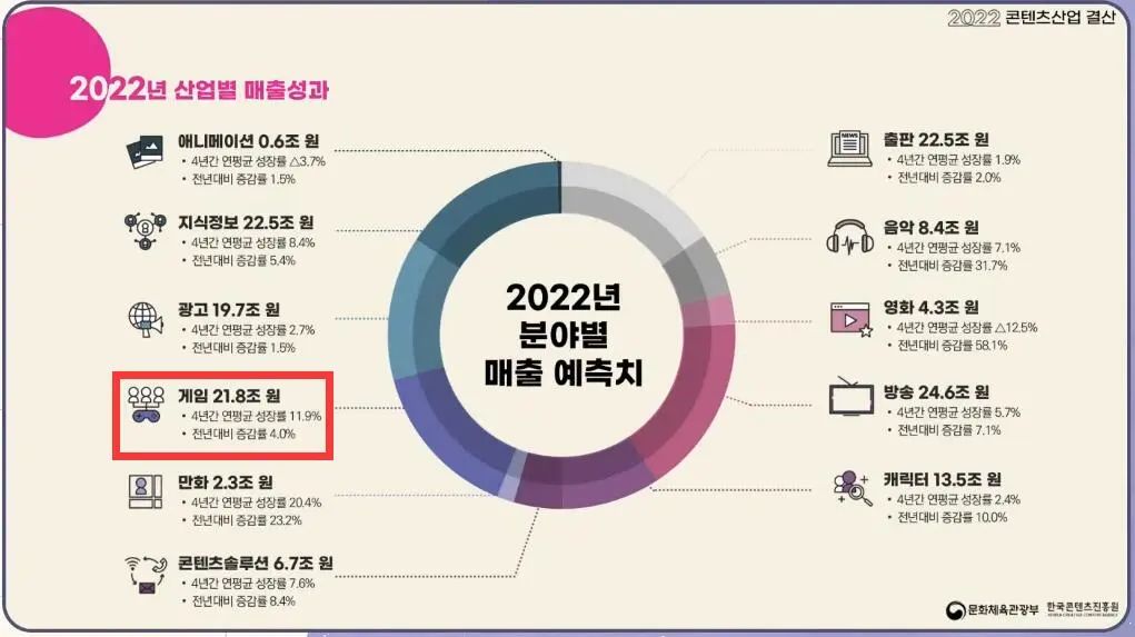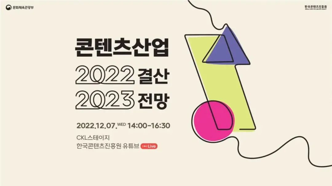 12月7日,韩国文化体育观光部朴普均携韩国文化产业振兴院(KOCCA)院长共同在首尔召开了“韩国内容产业2022总结与2023展望研讨会”。会上,KOCCA对2022年韩国内容产业的总体表现进行了数据面的梳理和预估。