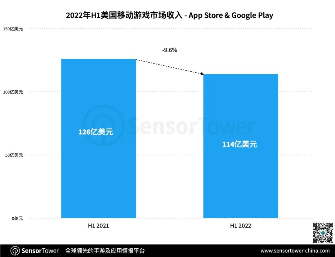 Sensor Tower数据显示,2022年上半年美国手游市场的销售额与去年同期相比下降了9.6%,另一家市场调查公司NPD集团的《美国游戏产业市场报告》也指出,自2021年11月以来,美国手游市场的销售额有所下降。