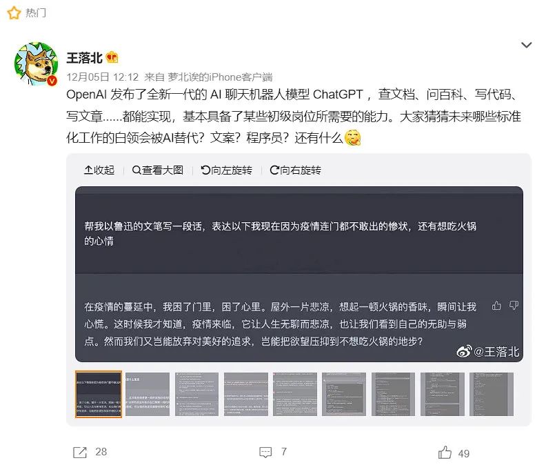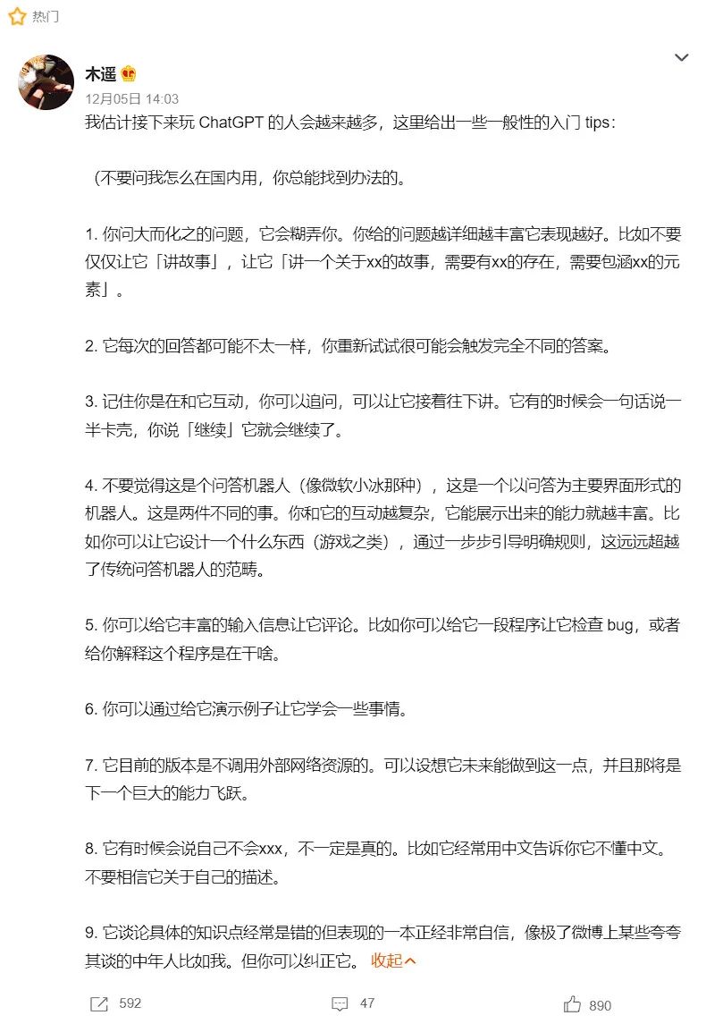 由于对中文也有良好的支持,如此全能的ChatGPT不仅在海外,近期也火遍了国内各大社交平台。在微博上,除了有人演示ChatGPT的各种玩法如查资料、码代码、写歌写文章外,还畅想了未来可能被替代的工种,其中,教导人们如何科学使用ChatGPT的微博也成为热门。