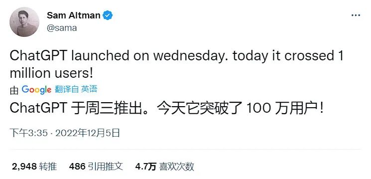 12月5日,Open AI联合创始人Sam Altman在推特上宣布,旗下新的聊天机器人ChatGPT正式突破百万用户。ChatGPT于上周三上线,也就是说,在推出短短五天时间里,这款AI就吸引了超过100万名用户。