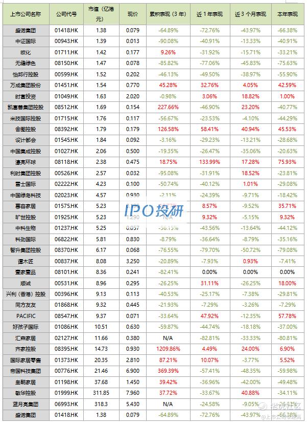 3、市值最高的是蓝月亮集团(06993.HK),市值为318.30亿元;市值最低的是盛诺集团(01418.HK),市值为1.38亿元。