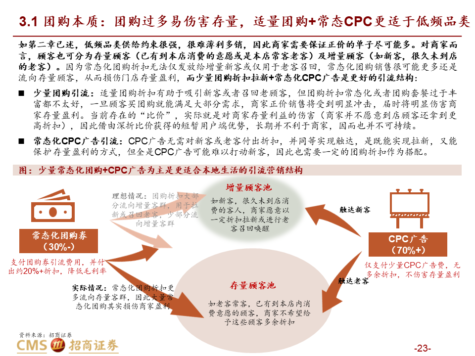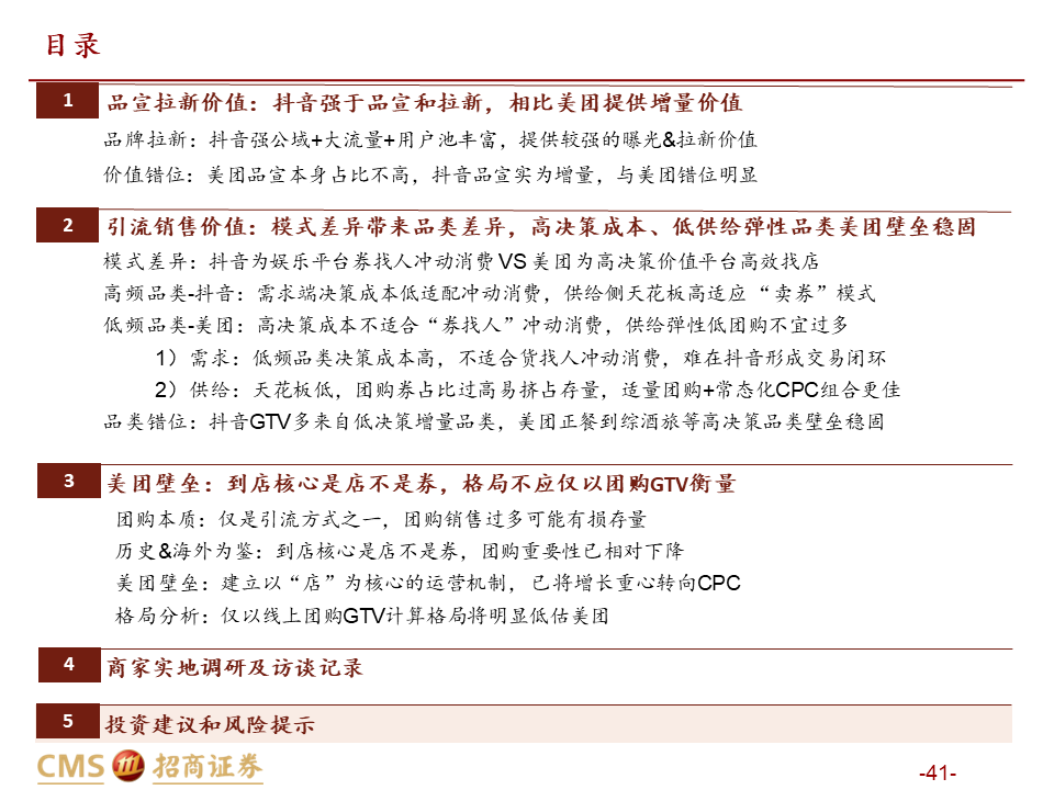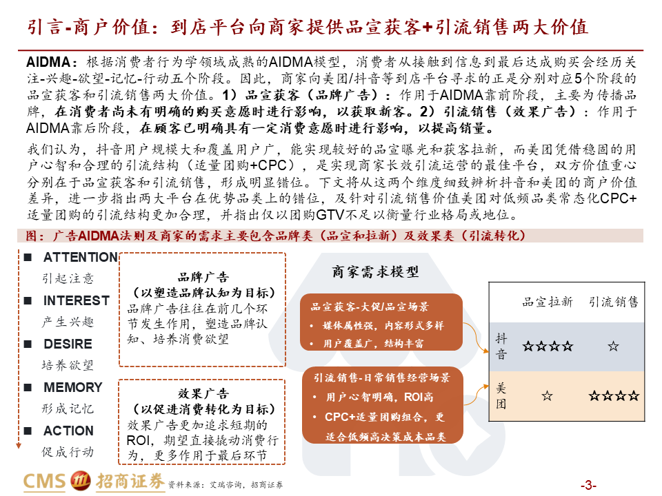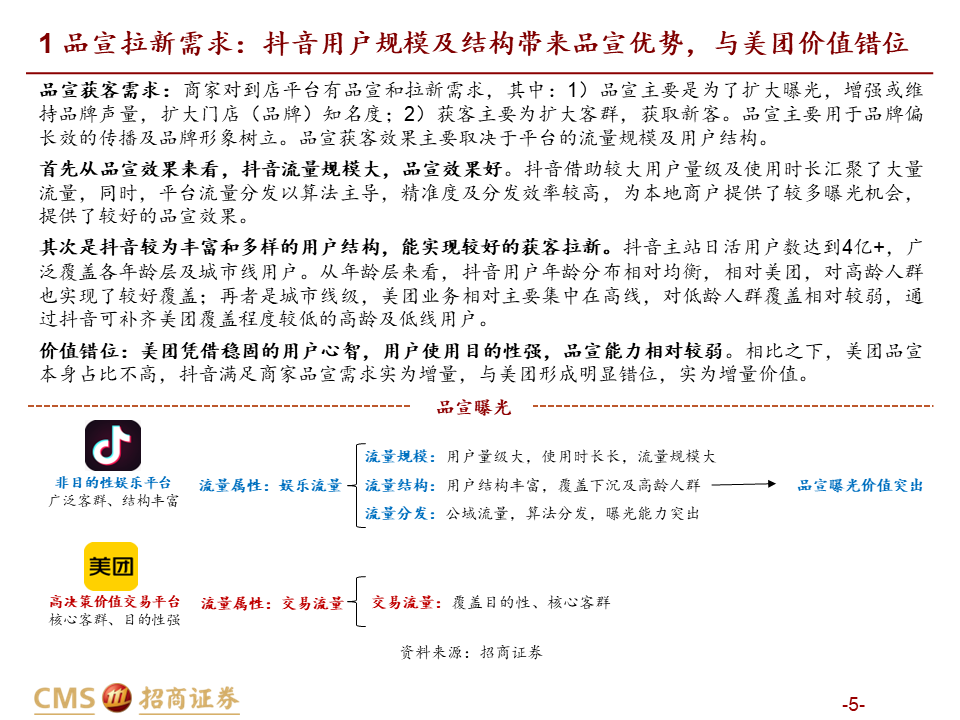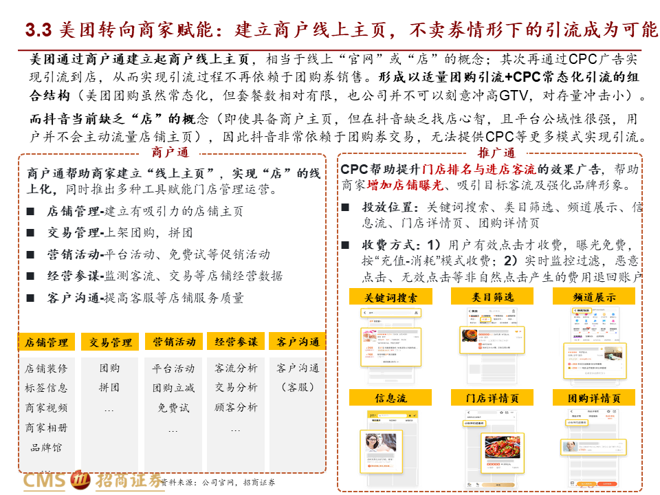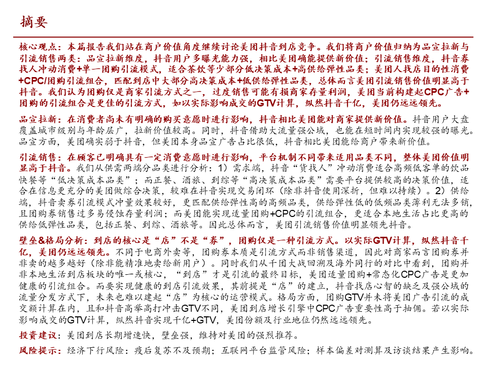 核心观点:本篇报告我们站在商户价值角度继续讨论美团抖音到店竞争。我们将商户价值归纳为品宣拉新与引流销售两类:品宣拉新维度,抖音用户多曝光能力强,相比美团确能提供新价值;引流销售维度,抖音券找人冲动消费+单一团购引流模式,适合茶饮等少部分低决策成本+高供给弹性品类;美团人找店目的性消费+CPC/团购引流组合,匹配到店中大部分高决策成本+低供给弹性品类,总体而言美团引流销售价值明显高于抖音。我们认为团购仅是商家引流方式之一,过度销售可能有损商家存量利润,美团当前构建起CPC广告+团购的引流组合是更佳的引流方式,如以实际影响成交的GTV计算,纵然抖音千亿,美团仍远远领先。