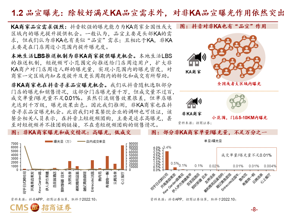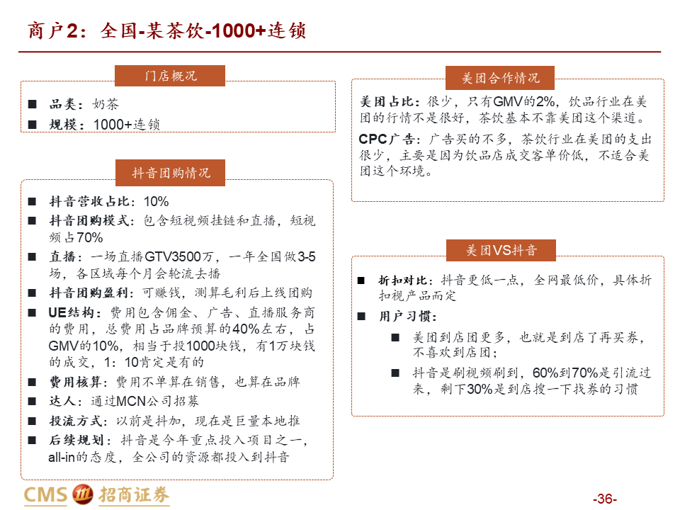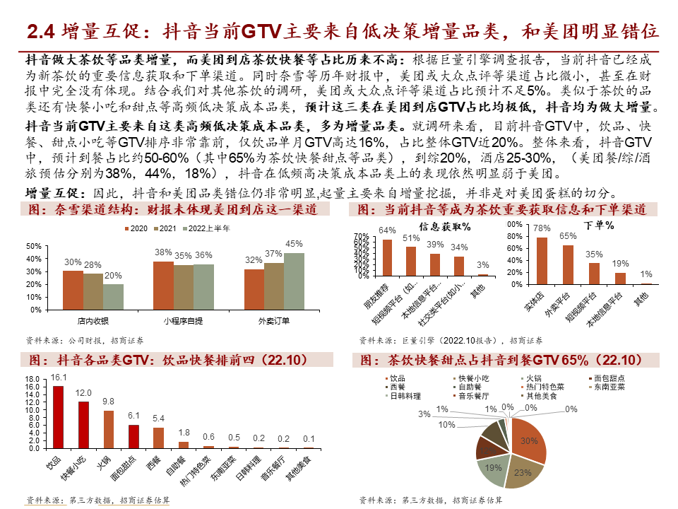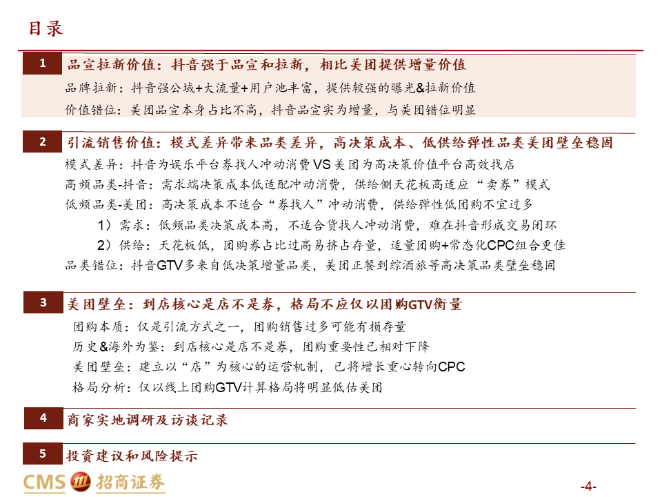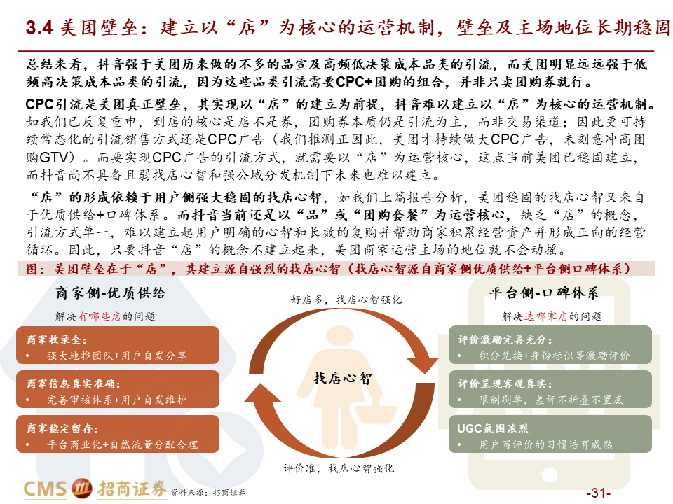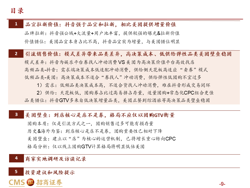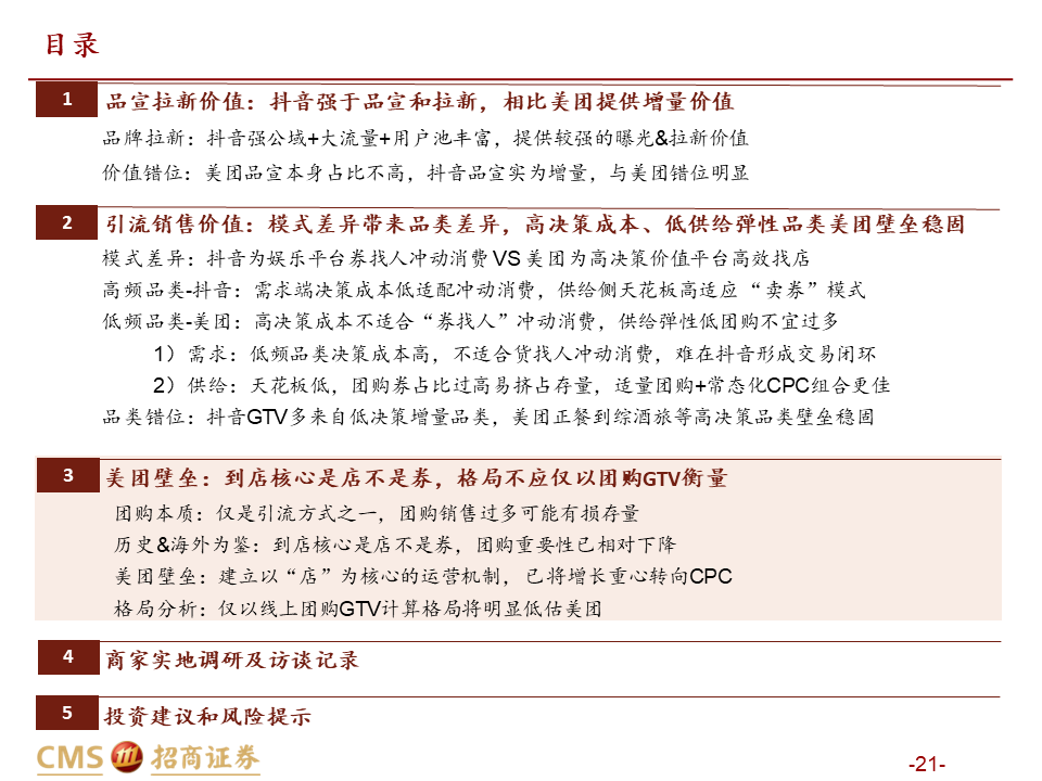 核心观点:本篇报告我们站在商户价值角度继续讨论美团抖音到店竞争。我们将商户价值归纳为品宣拉新与引流销售两类:品宣拉新维度,抖音用户多曝光能力强,相比美团确能提供新价值;引流销售维度,抖音券找人冲动消费+单一团购引流模式,适合茶饮等少部分低决策成本+高供给弹性品类;美团人找店目的性消费+CPC/团购引流组合,匹配到店中大部分高决策成本+低供给弹性品类,总体而言美团引流销售价值明显高于抖音。我们认为团购仅是商家引流方式之一,过度销售可能有损商家存量利润,美团当前构建起CPC广告+团购的引流组合是更佳的引流方式,如以实际影响成交的GTV计算,纵然抖音千亿,美团仍远远领先。
