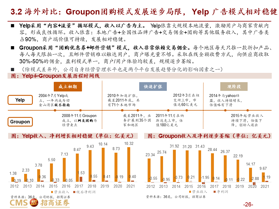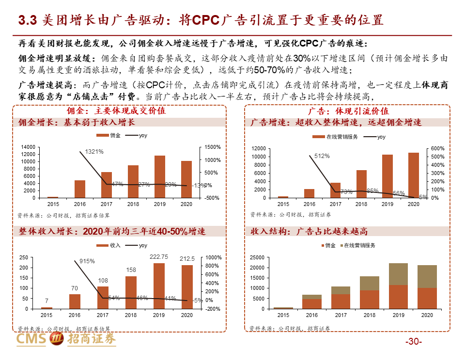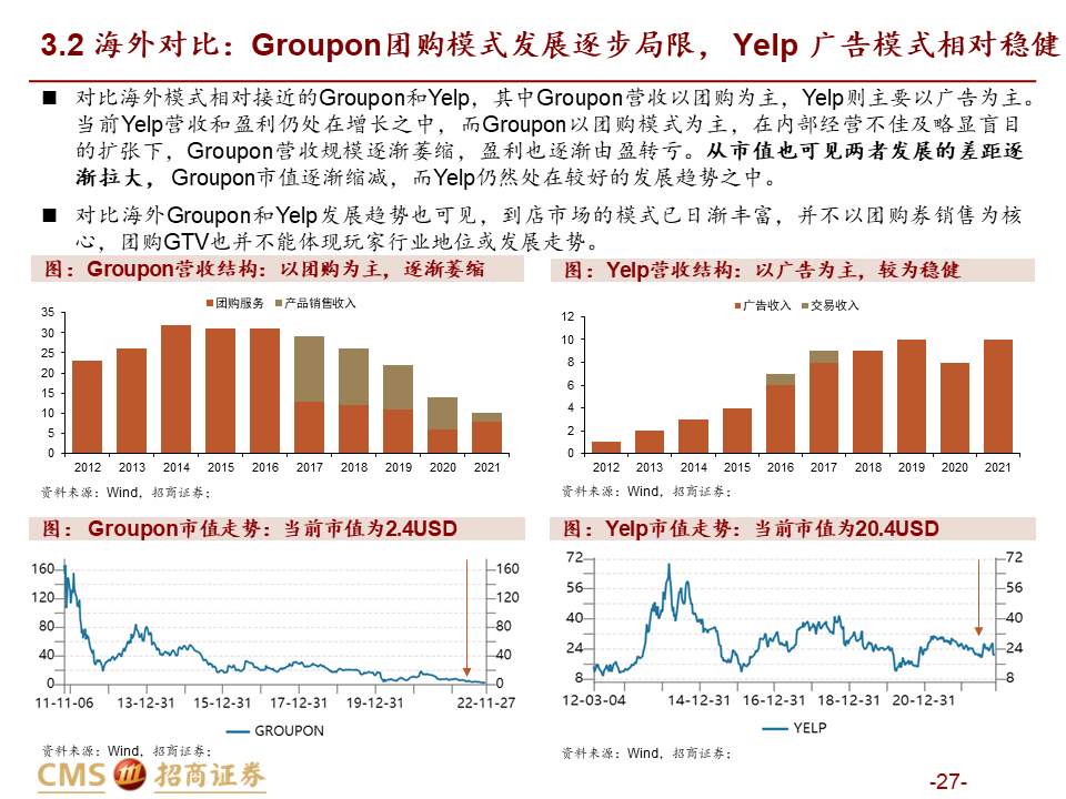 壁垒&格局分析:到店的核心是“店”不是“券”,团购仅是一种引流方式。以实际GTV计算,纵然抖音千亿,美团仍远远领先。不同于电商外卖等,团购券本质是引流方式而非销售渠道,因此对商家而言团购券并非卖的越多越好(除非能精准地卖给新用户)。同时我们从千团大战回溯及海外同行的对比中看到,团购并非本地生活到店板块的唯一或核心,“到店”才是引流的最终目标,美团适量团购+常态化CPC广告是更加健康的引流组合。而要实现健康的到店引流效果,其前提是“店”的建立,抖音找店心智的缺乏及强公域的流量分发方式下,未来也难以建起“店”为核心的运营模式。格局方面,团购GTV并未将美团广告引流的成交额计算在内,且和抖音高举高打冲击GTV不同,美团到店增长引擎中CPC广告重要性高于抽佣。若以实际影响成交的GTV计算,纵然抖音实现千亿+GTV,美团份额及行业地位仍然远远领先。