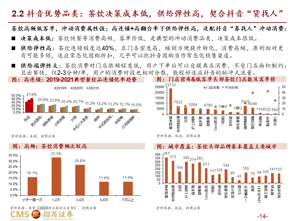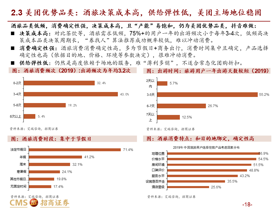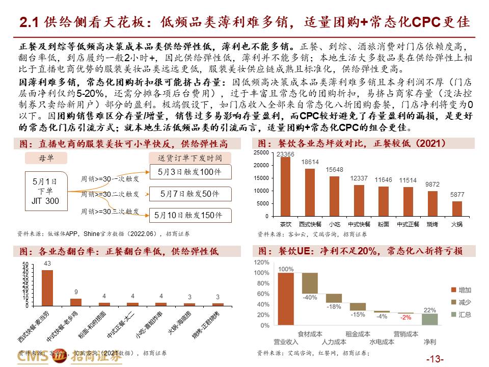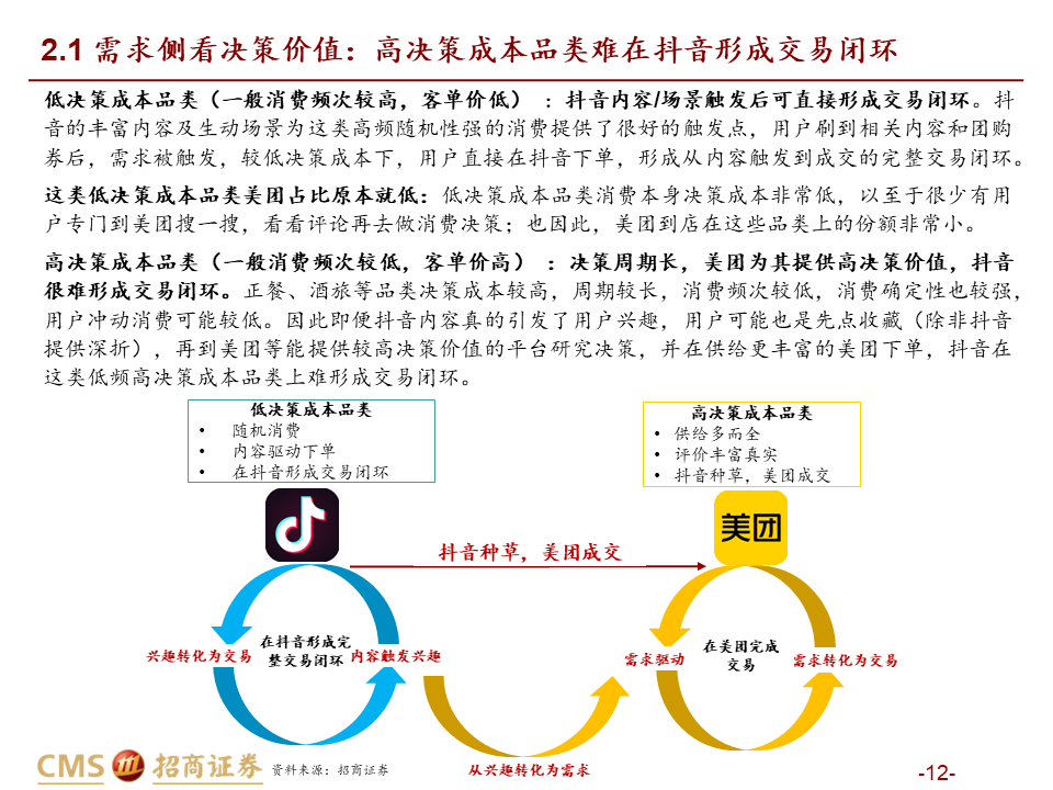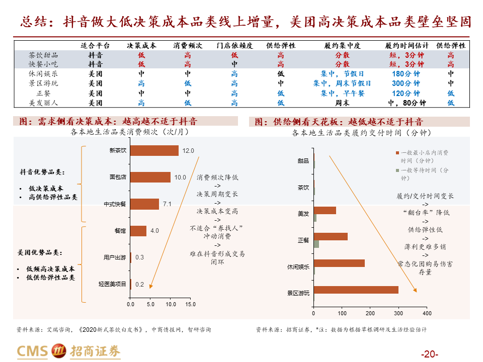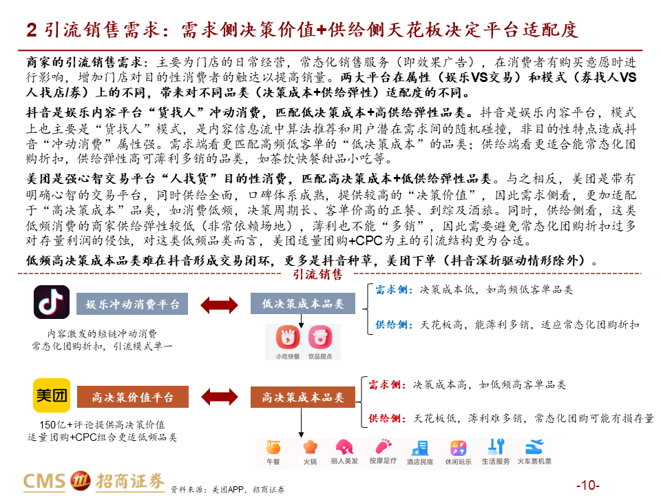 引流销售:在顾客已明确具有一定消费意愿时进行影响,平台机制不同带来适用品类不同,整体美团价值明显高于抖音。我们从供需两端分品类进行分析:1)需求端,抖音“货找人”冲动消费适合高频低客单的饮品快餐等“低决策成本品类”;而正餐、酒旅、到综等“高决策成本品类”需要平台提供较高的决策价值,适合在信息更充分的美团做综合决策,较难在抖音实现交易闭环(除非抖音使用深折,但难以持续)。2)供给端,抖音卖券引流模式冲量效果较好,更匹配供给弹性高的高频品类,供给弹性低的低频品类薄利无法多销,且团购券销售过多易侵蚀存量利润;而美团能实现适量团购+CPC的引流组合,更适合本地生活占比更高的供给低弹性品类,包括正餐、到综、酒旅等。因此总体而言,美团引流销售价值明显领先抖音。