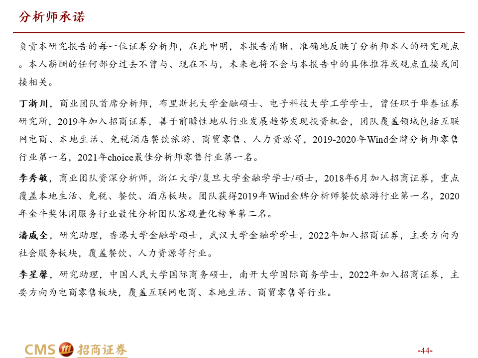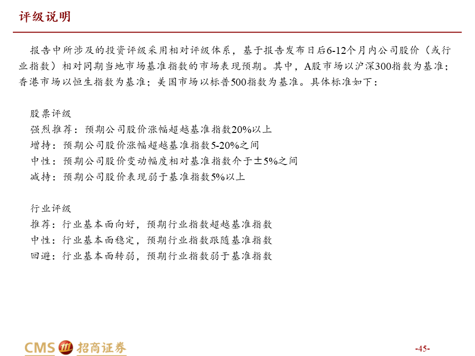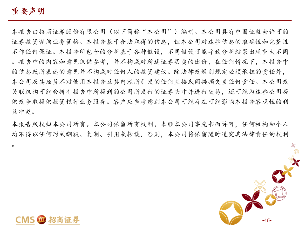 本报告由招商证券股份有限公司(以下简称“本公司”)编制。仅对中国境内投资者发布,请您自行评估接收相关内容的适当性。本公司不会因您收到、阅读相关内容而视您为中国境内投资者。本公司具有中国证监会许可的证券投资咨询业务资格。本报告基于合法取得的信息,但本公司对这些信息的准确性和完整性不作任何保证。本报告所包含的分析基于各种假设,不同假设可能导致分析结果出现重大不同。报告中的内容和意见仅供参考,并不构成对所述证券买卖的出价,在任何情况下,本报告中的信息或所表述的意见并不构成对任何人的投资建议。除法律或规则规定必须承担的责任外,本公司及其雇员不对使用本报告及其内容所引发的任何直接或间接损失负任何责任。本公司或关联机构可能会持有报告中所提到的公司所发行的证券头寸并进行交易,还可能为这些公司提供或争取提供投资银行业务服务。客户应当考虑到本公司可能存在可能影响本报告客观性的利益冲突。