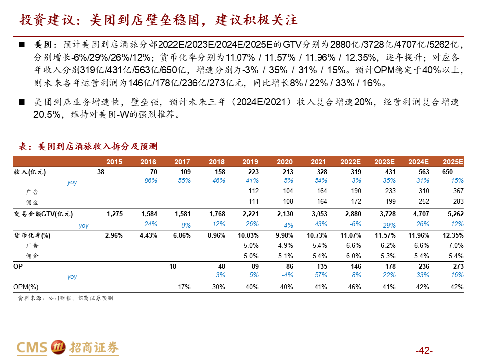 投资建议:美团到店长期增速快,壁垒强,维持对美团的强烈推荐。