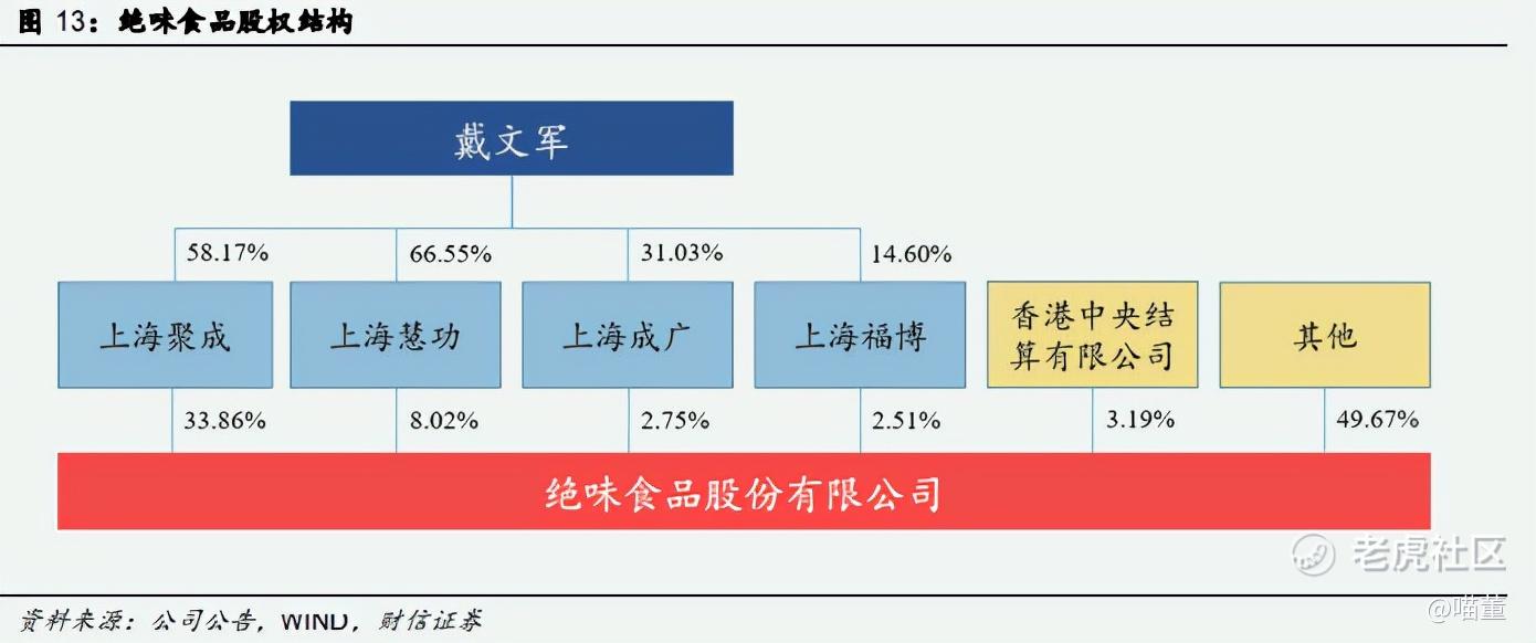 创始人戴文军先生为公司实控人,持股平台绑定各方利益。创始人戴文军先生通过上海聚成、上海慧功、上海成广、上海福博间接持有绝味食品股份,为公司实际控制人。 上海聚成、上海慧功、上海成广、上海福博为公司搭建的持股平台,主要股东为公司管理层,公司员工、供应商与加盟商亦有持股,各方利益深度绑定。