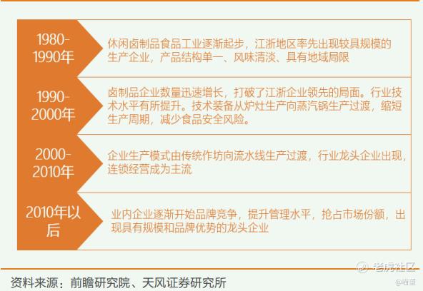 在行业的快速发展阶段(2000-2010),市场需求不断扩大,行业标准开始形成,龙头企业涌现。居民生活水平的提高扩大了对休闲卤制食品的需求,无法满足需求的传统生产方式逐渐向流水线生产过渡,较高技术和卫生的行业标准改善了行业竞争状态,驱散了不能达标的企业。行业内龙头企业开始显现,品牌建设、连锁经营成为主流。