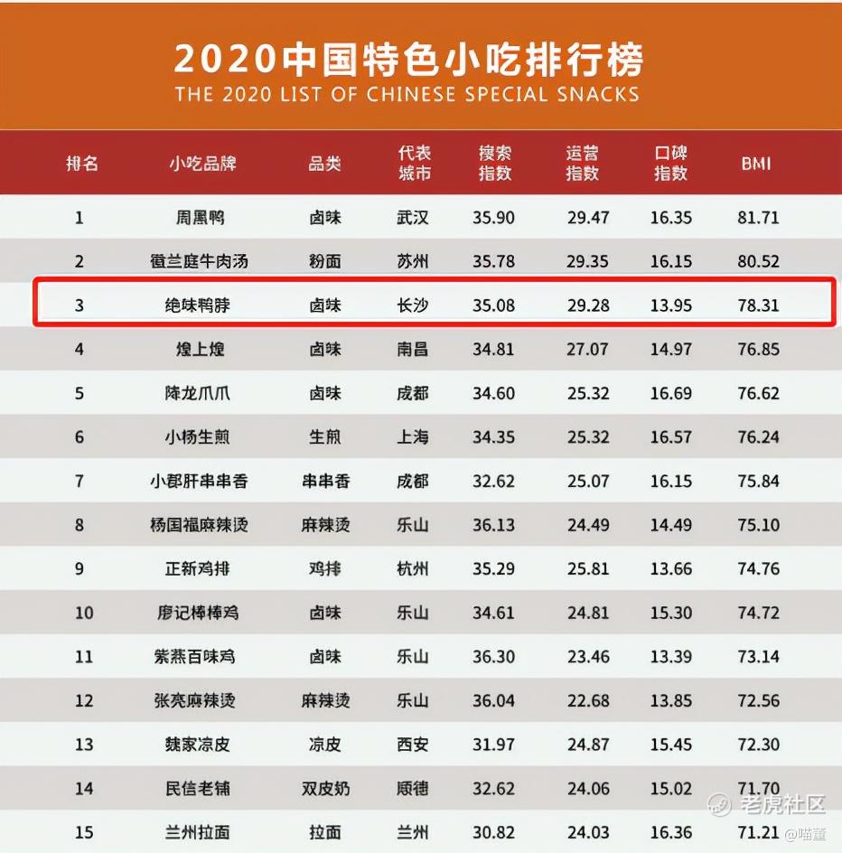 2020年由美团点评联合餐饮老板内参在北京联合发布了《中国餐饮报告2020》,为了反映当前国内小吃品牌的发展状况,报告还同时发布了《2020年度中国特色小吃排行榜》,整理、汇总、分析第三方数据,从小吃人均消费金额、品牌分布区域、市场关注度、品牌建设、口碑表现等方面进行比较,综合计算品牌营销价值得出品牌营销指数排名(BMI)。