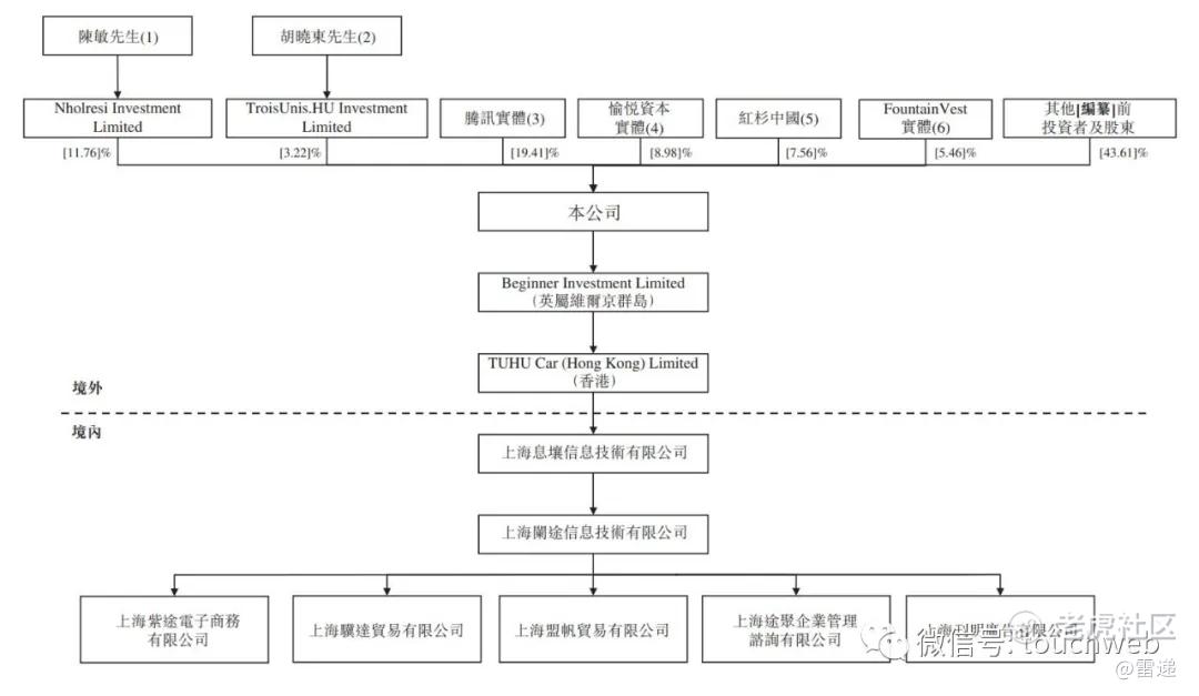 IPO前,陈敏持股为11.76%,胡晓东持股为3.22%,腾讯持股为19.41%,愉悦资本持股为8.98%,红杉中国持股为7.56%,FountainVest持股为5.46%。百度持股为2%,中金持股为2.32%。