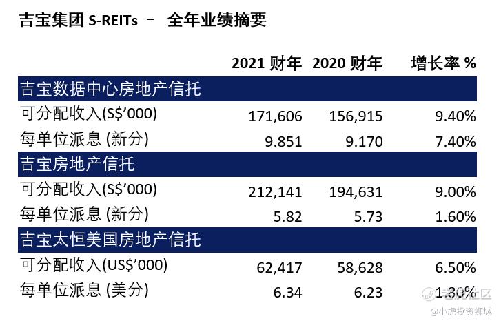 其中,吉宝集团(Keppel Group)旗下的三只S-REITs,即吉宝数据中心房地产信托$KEPPEL DC REIT(AJBU.SI)$ 、吉宝房地产信托$KEPPEL REIT(K71U.SI)$ 和吉宝太恒美国房地产信托$KEPPEL-KBS US REIT(CMOU.SI)$ 均于上周公布了2021年全年财务业绩。