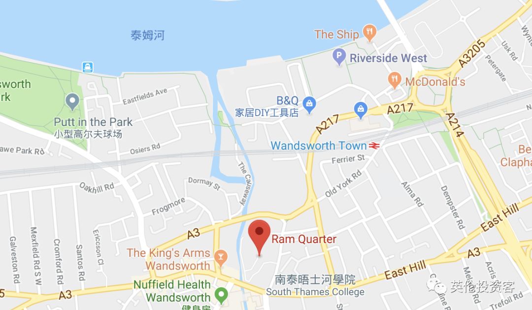 地块具**置如下,邮编是SW18 1TH,步行8分钟可达泰晤士河畔,旁边最近的车站是Wandsworth Town火车站。