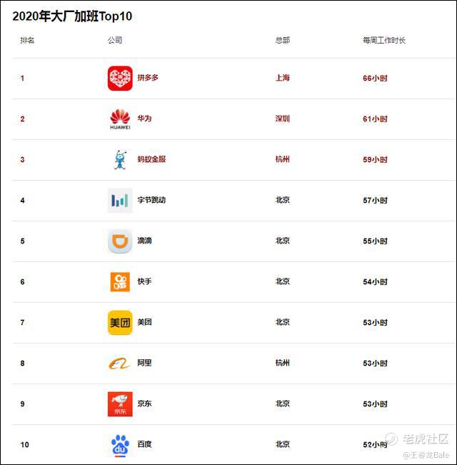 来自媒体的不完全统计显示,2020年大厂加班TOP10公司中,拼多多、华为、蚂蚁金服、字节跳动、滴滴、快手等纷纷上榜。特别是拼多多和华为,员工每周工作时长都超过了60小时,即便是6天工作制,每天的工作时间都超过了10个小时。